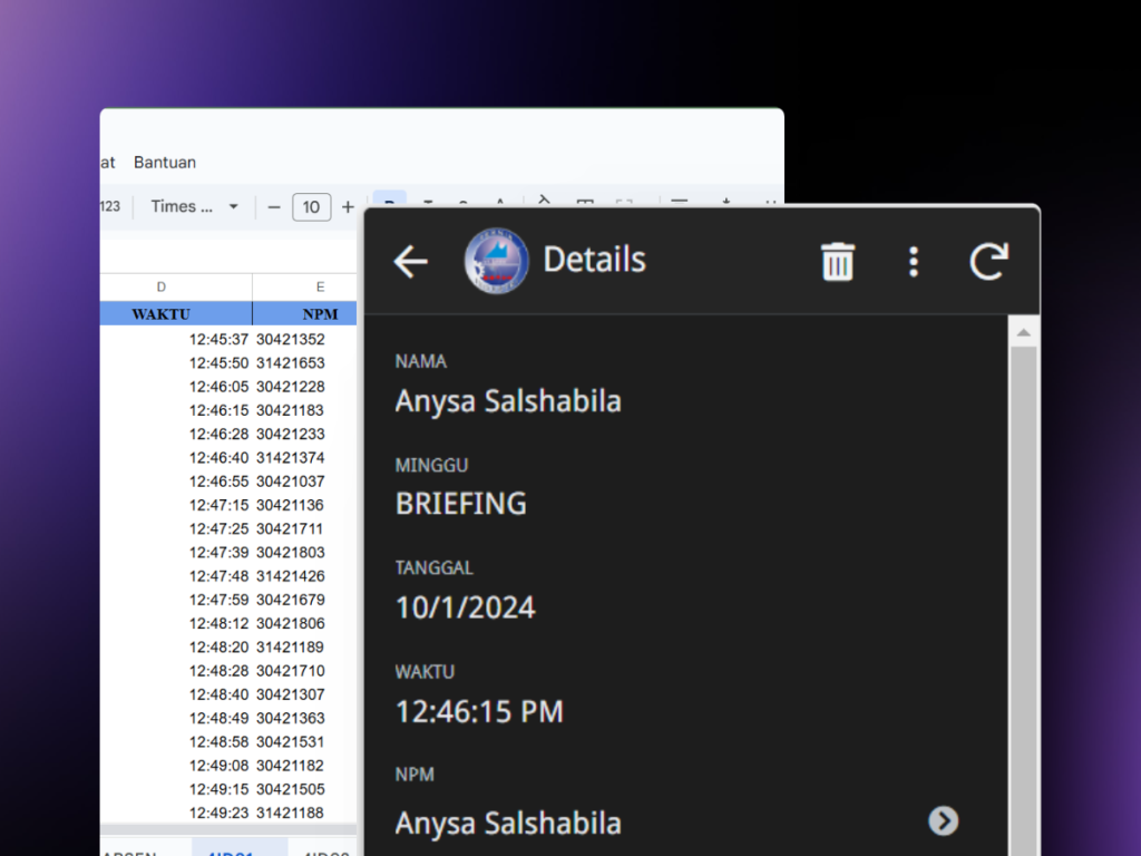 The integration of the attendance database and AppSheet is a system designed to make attendance automatic and time-efficient by scanning through the AppSheet application, directly connected to the database. The goal is to prevent data manipulation, improve efficiency, and enable real-time automatic data storage.